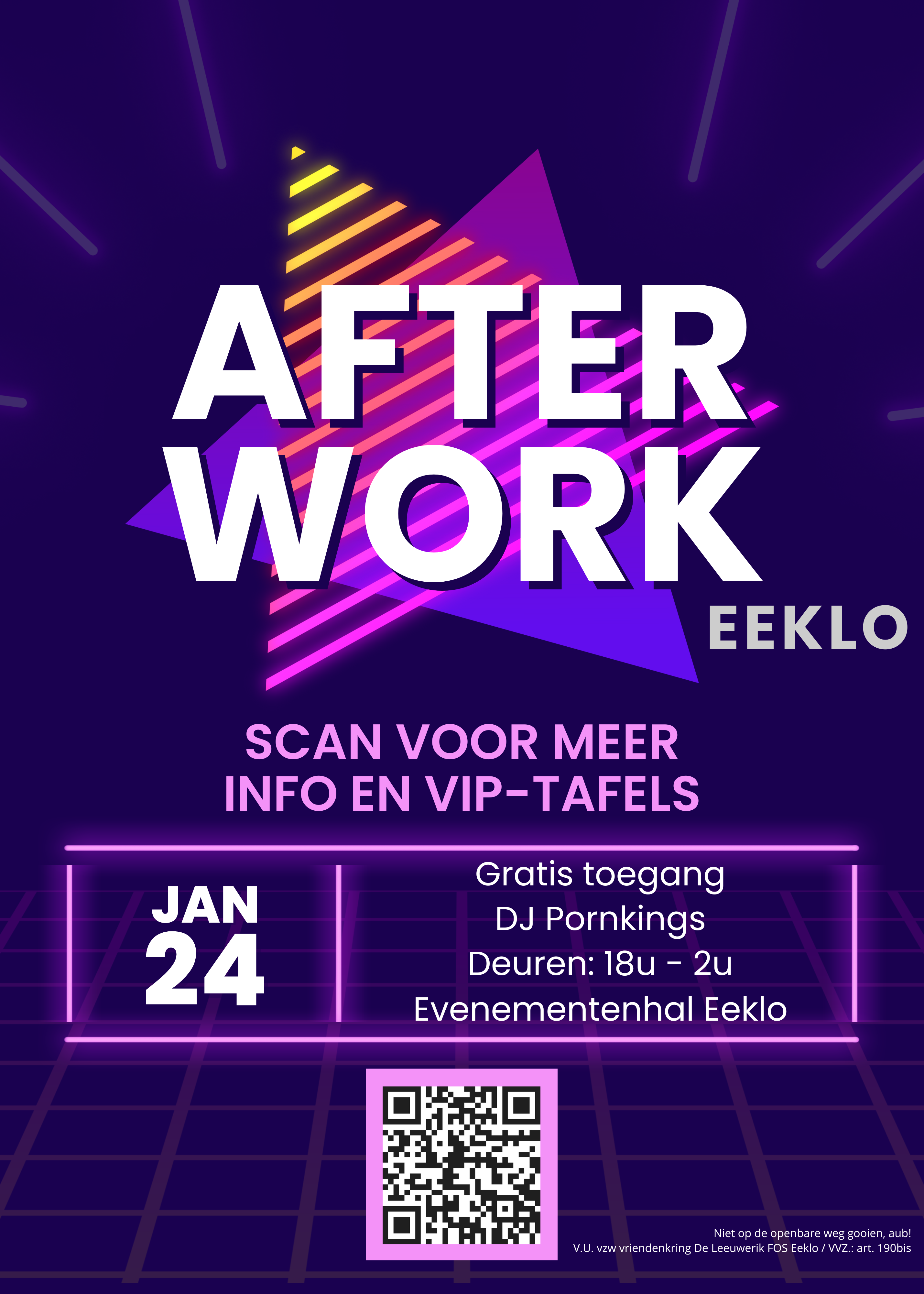 Op vrijdag 24 januari 2025 organiseren we een afterwork party in de Eeklose evenementenhal. Dit is dé ideale gelegenheid om na het werk samen te komen met collega’s, vrienden en andere ouders voor een ontspannen avond vol muziek, hapjes en drankjes in een feestelijke sfeer.